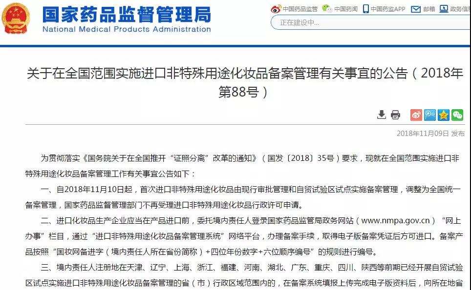 重磅!全國(guó)范圍實(shí)施進(jìn)口非特殊化妝品備案管理(2018年第88號(hào))